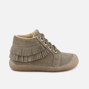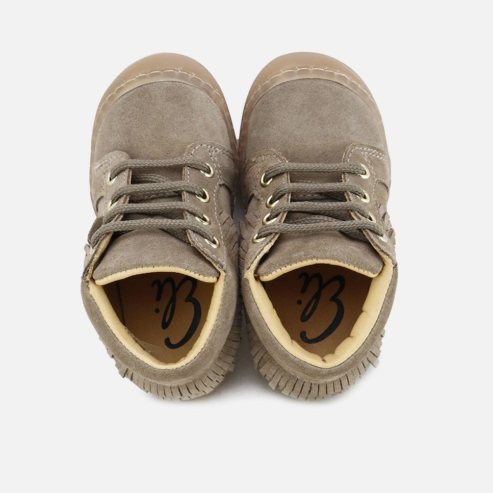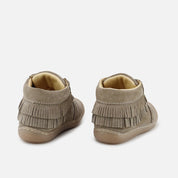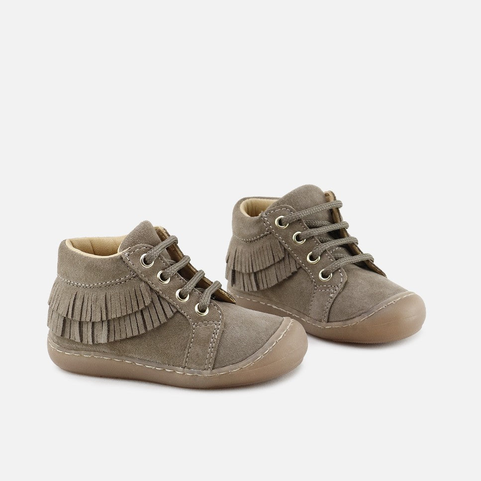 16707AH-VELOUR-CAFEThese are the ideal boots if you're looking for something wearable yet special. They feature fringes and a protected toe cap, and are part of the CUCADA collection, which accompanies our little ones' feet as they gain confidence as they walk, so that they gradually grow stronger and develop freely, while protecting them with every step. Designed to be different from their basics, they can be combined with everything. With a higher sole, we try to protect them from rubbing and give them more security from crawling until their goal is to climb in any park ;) Made of high-quality, water-repellent cowhide split leather, with a breathable cowhide lining that prevents sweat and keeps feet at their ideal temperature. Lace-up closure makes them adapt to any foot. Designed and handcrafted with high-quality materials and featuring our special last to promote the safety and confidence of little feet taking their first steps, with a wide front to allow room for their toes. Featuring a flat rubber sole, flexible and non-slip, yet resistant to any surface. Choose traditional footwear, improved by the advancements of so many years of tradition, for today's children. Quality footwear is an investment in sustainability. Available from sizes 18 to 26.