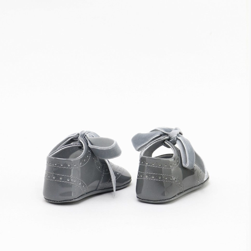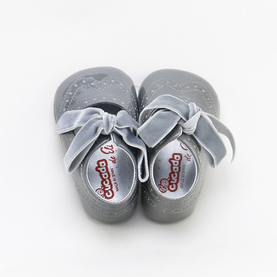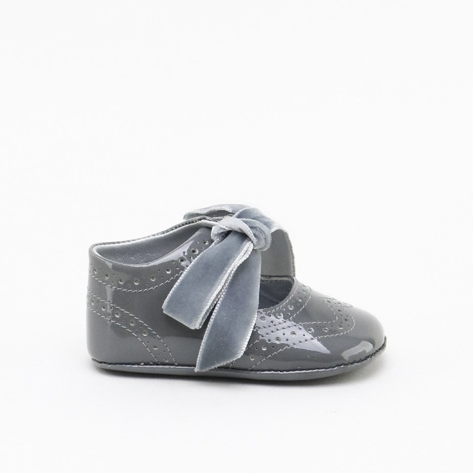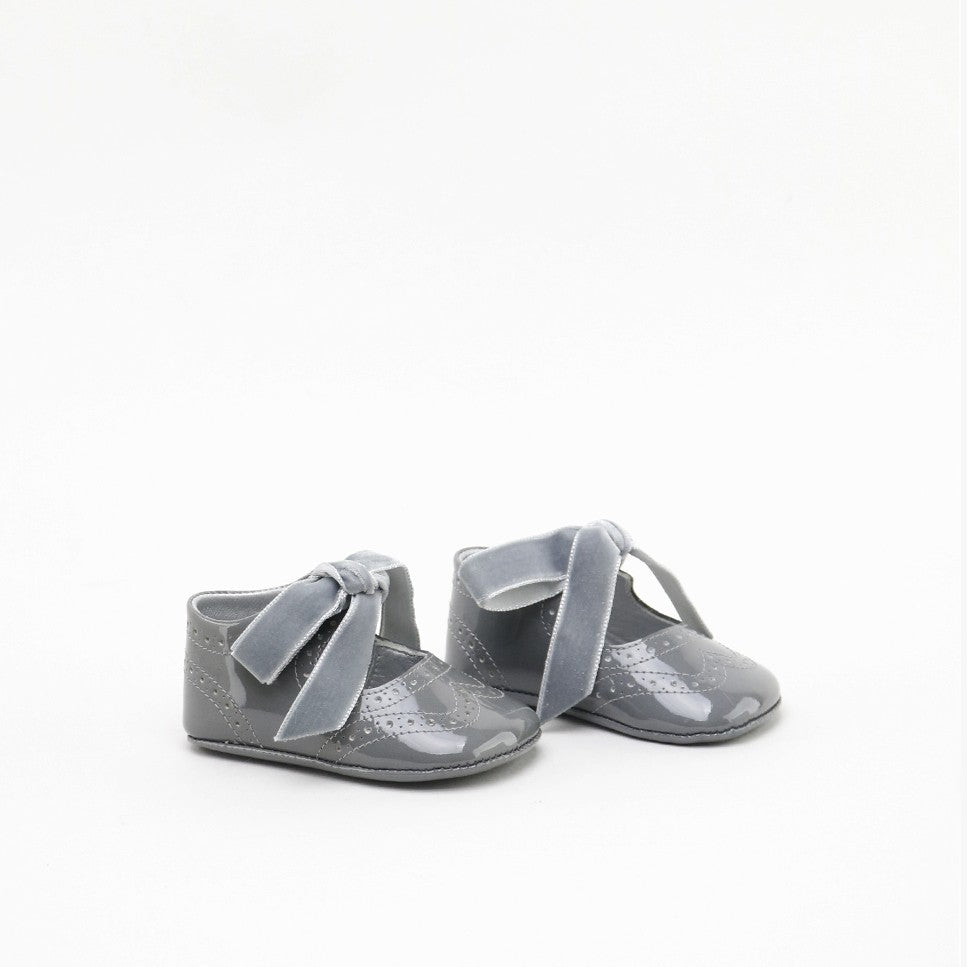 Baby Mercedes in bovine patent leather with matching velvet bow.