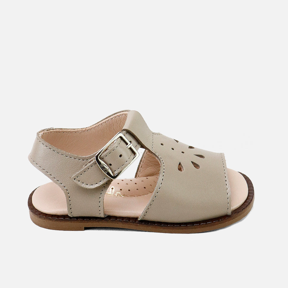 The sandal of the season. With a classic cut and retro brogue detailing, they're so special they'll become a wardrobe staple this summer. Timeless shoes for today's children. They belong to the CUCADA collection, designed to support the feet of our loved ones as they gain confidence walking, gradually strengthening and developing freely while protecting them with every step. Made of bovine leather, with a cushioned insole and a high-quality, breathable, and very soft goatskin lining, for comfort and coolness! Buckle closure. Designed and manufactured in Villena, with style while maintaining all the important features of fit and stability for healthy footwear for first walkers. A wide last allows complete freedom of movement for their toes, and a flat, non-slip, flexible rubber sole with a leather-like effect.