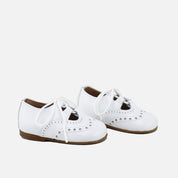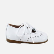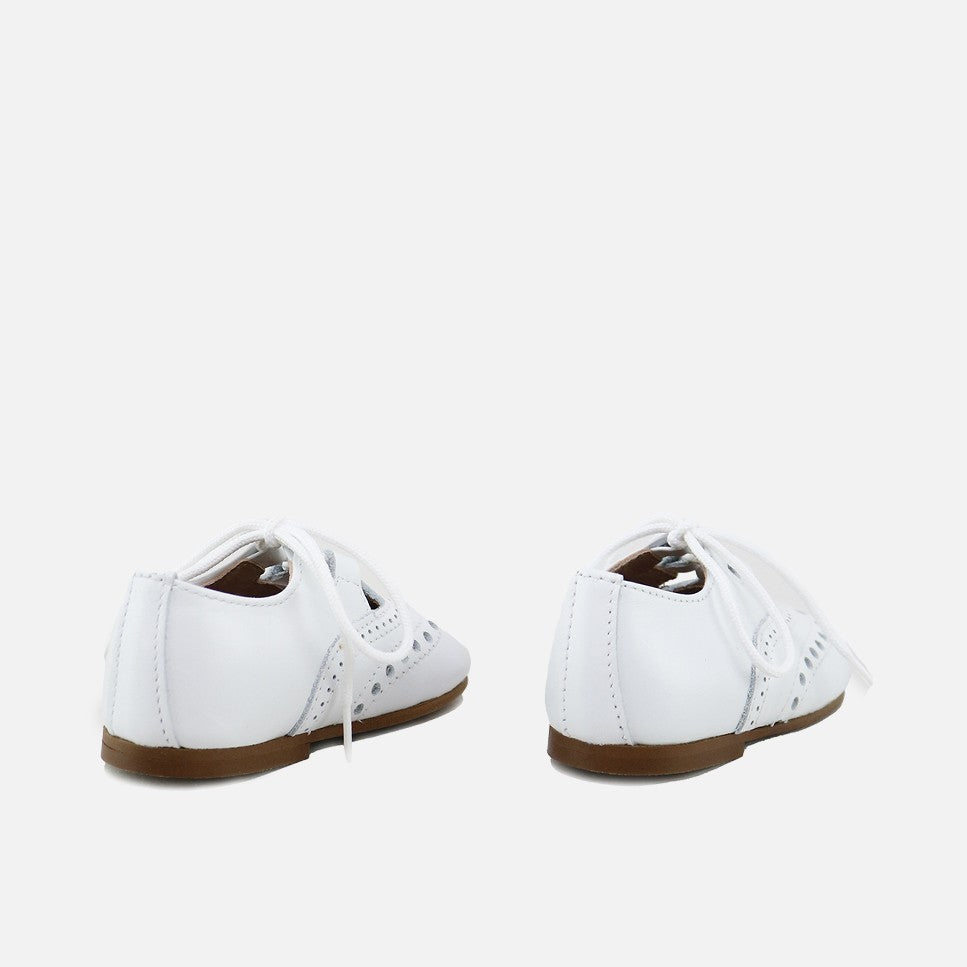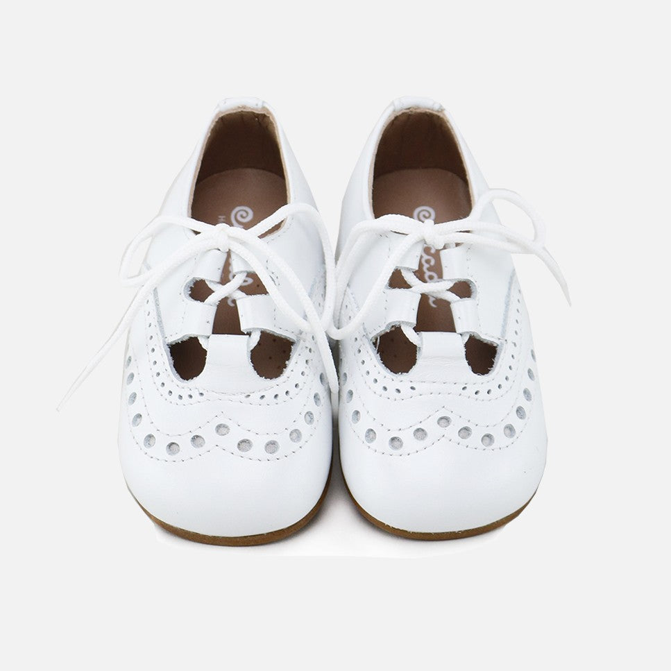 Let's welcome one of the season's most special restylings. Together with its partner, the Mary Jane, they keep our #Eliclassics at the top of the most beloved shoes year after year. A pointed English shoe from the CUCADA collection, it accompanies feet from size 17 onwards as they gain confidence while walking, gradually strengthening and developing freely, yet protecting them with every step. Made of cowhide leather and a high-quality, breathable, and very soft goatskin lining, they can be worn with or without socks. Matching cotton lace closure. Designed and manufactured in Villena, with style while maintaining all the important fit and stability characteristics of healthy footwear for first-time walkers. A wide last to give little toes complete freedom, and a flat, non-slip, and flexible rubber sole. Handmade in Spain with love.