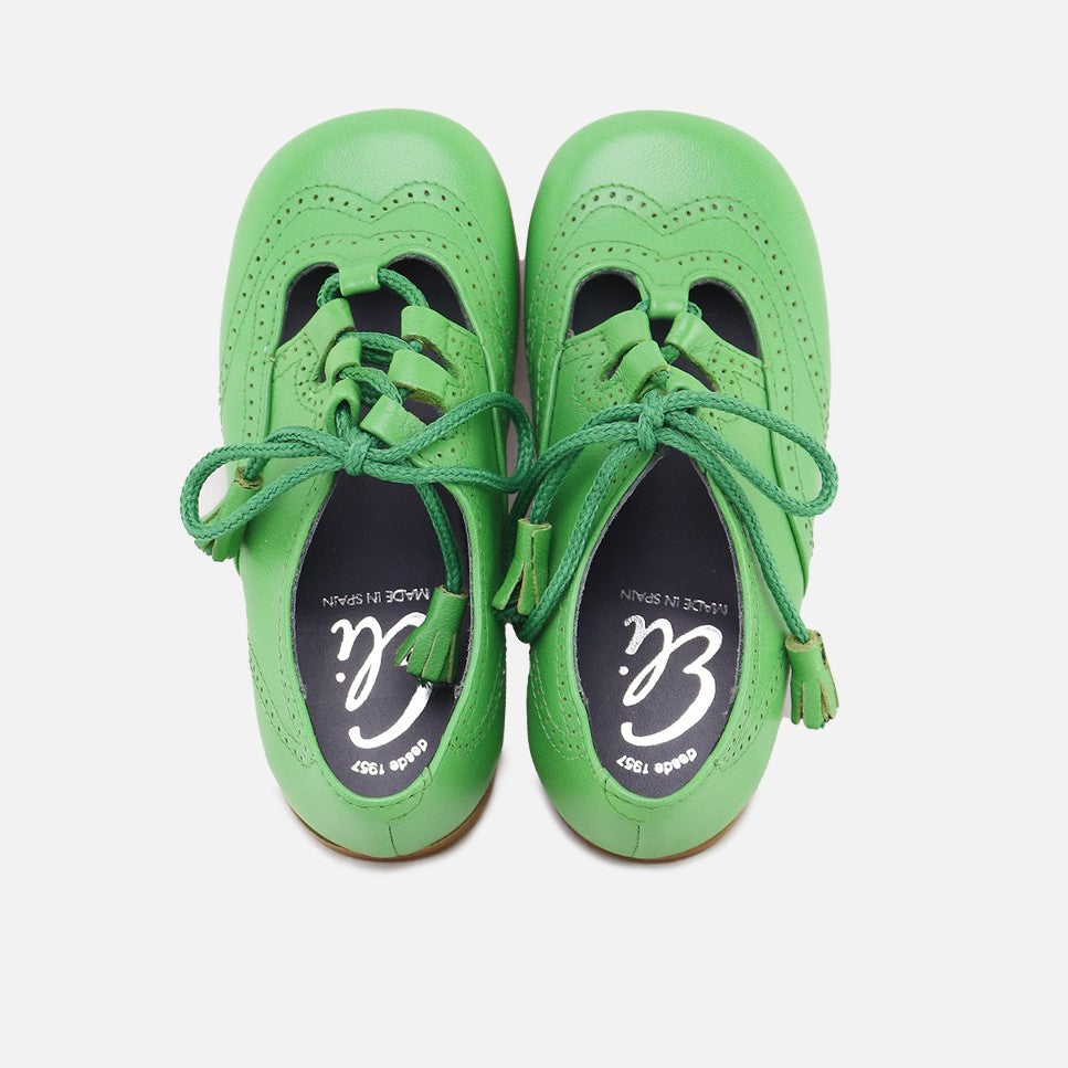 Classic Eli English shoe with perforations, tongueless version. The favourite shoe for dressing with class and style. Its shape, cut and perforations make it a best-seller year after year. The classics that will last over time and that make the difference at first sight. Made of high quality leather with breathable leather lining that prevents sweat and keeps feet at their ideal temperature. Available in various combinations, choose your favourite! Closure with round cotton laces with tassels of the same leather. Designed and handcrafted in Villena with high quality materials and with our shape so highly valued for its style and for preserving all the characteristics of fit and stability, favouring the safety and confidence of children's steps. With a thin, flexible and non-slip rubber sole, but resistant to any surface. Go for the footwear of a lifetime, improved by the advances of so many years of tradition, for today's children. Quality footwear is an investment in sustainability. They fit their true size. Handmade in Spain with love.
