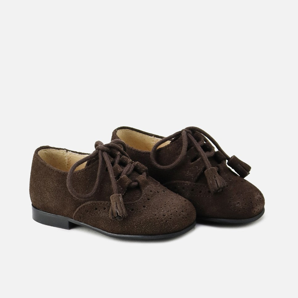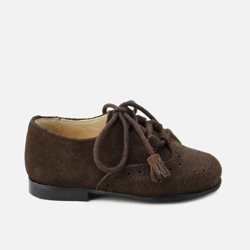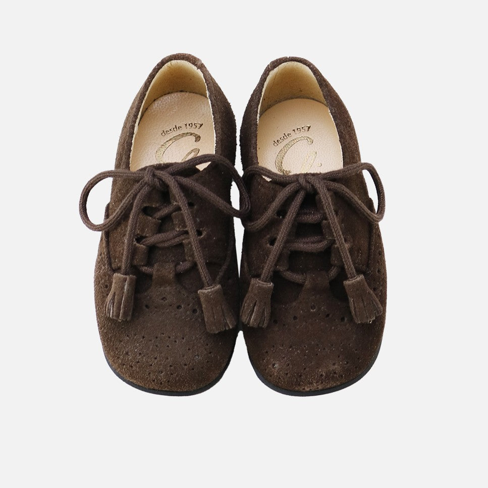 Classic Eli English shoe with perforations. The go-to shoe for dressing with class and style. Their shape, cut, and perforations make them a best-seller year after year. Classics that will endure and make a difference at first glance. Made of high-quality split cowhide with a breathable leather lining that prevents sweat and keeps feet at their ideal temperature. Available in various combinations; choose your favorite! Fastens with a round cotton lace with tassels made of the same leather. Designed and handcrafted in Villena with high-quality materials and with our last, so highly regarded for its style and for maintaining all the characteristics of fit and stability, promoting safe and confident steps for children. With a thin, flexible, non-slip rubber sole, yet resistant to any surface. Opt for traditional footwear, improved by the advances of so many years of tradition, for today's children. Quality footwear is an investment in sustainability. Handmade in Spain with love.