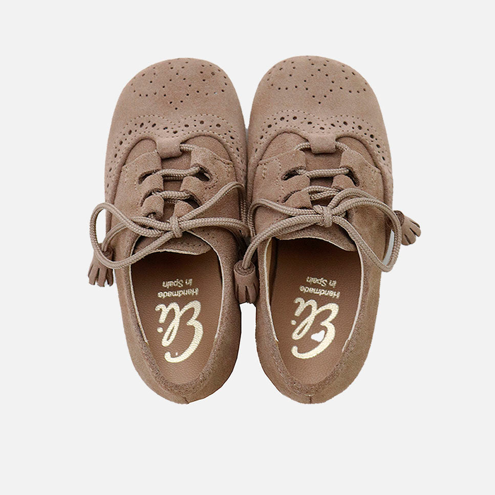 Classic Eli English shoe with perforations. The go-to shoe for dressing with class and style. Their shape, cut, and perforations make them a best-seller year after year. Classics that will endure and make a difference at first glance. Made of high-quality split cowhide with a breathable leather lining that prevents sweat and keeps feet at their ideal temperature. Available in various combinations; choose your favorite! Fastens with a round cotton lace with tassels made of the same leather. Designed and handcrafted in Villena with high-quality materials and with our last, so highly regarded for its style and for maintaining all the characteristics of fit and stability, promoting safe and confident steps for children. With a thin, flexible, non-slip rubber sole, yet resistant to any surface. Opt for traditional footwear, improved by the advances of so many years of tradition, for today's children. Quality footwear is an investment in sustainability. Handmade in Spain with love.