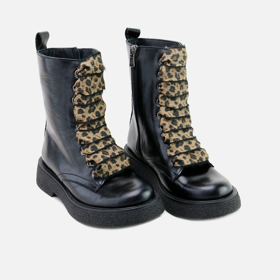 This season's trendiest military boots. With these exquisite quality boots, we want Eli's feet to be on trend, yet protected and comfortable, while maintaining our signature style. A good boot that you won't want to take off all winter is the key to months full of new adventures and projects. Let nothing stop you! Made of high-quality cowhide, with a thick black TR sole and a full, breathable leather lining, they're perfect for the perfect mother-and-daughter, as they're available up to size 41. Their color and animal print lacing set them apart from the rest. Designed and handcrafted in Villena with high-quality materials. Opt for traditional footwear, improved by the advances of so many years of tradition, for today's children and women. Quality footwear is an investment in sustainability.