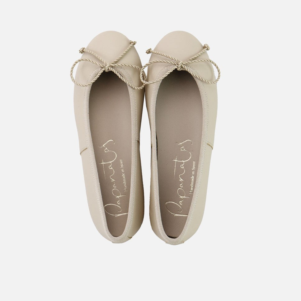 The classic ballerina flat with a fine cord and grosgrain ribbon bow from our PAPANATAS collection, which dresses the feet of girls and mothers. Ideal for sharing a style. Available in various combinations of high-quality leathers and fabrics, with a breathable, thermo-regulating textile lining and a breathable leather insole. Once worn, they adapt perfectly to the foot. Designed and handcrafted in Villena with high-quality materials and using our ballerina last, so highly regarded for its style and for maintaining all the characteristics of fit and stability, promoting safe and confident steps for girls and women. With a thin, flexible, and non-slip sole, yet resistant to any surface. Opt for traditional footwear, improved by the advances of so many years of tradition, for today's girls. Quality footwear is an investment in sustainability.