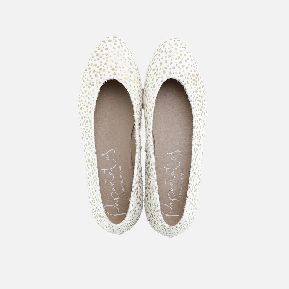 The perfect shoe for mother and daughter to share, and for the trendiest girls. Gold polka dot pony ballerina flats from our PAPANATAS collection, which adorns the feet of girls and women. Made with our tapered last, which older girls and their mothers will love. What better gift than hitting the pavement in the same shoes :) Made of cowhide with a combed-haired top grain and breathable leather lining. Opt for traditional footwear, improved by the advances of so many years of tradition. Quality footwear is an investment in sustainability. Designed and handcrafted in Villena with high-quality materials and with our ballerina last, so highly valued for its style and for maintaining all the characteristics of fit and stability, promoting the security and confidence of girls' and women's steps. With a thin, flexible, and non-slip sole, yet resistant to any surface. Handmade in Spain with love.