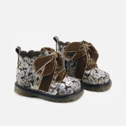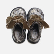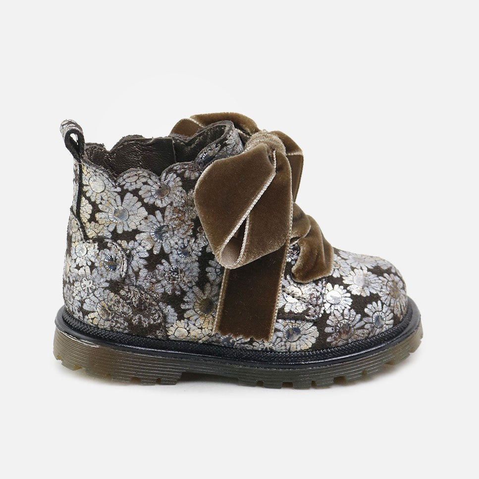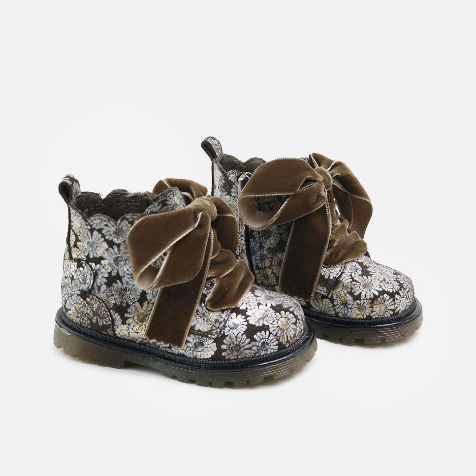 The all-terrain boot that triumphs year after year in the SIBARITAS catalog will once again be a hit with the trendiest feet this season, in a very special version. Its wave detail, its floral-embossed leather in ideal shades, and its thick sole make it the perfect choice from fall to spring. They will be a hit thanks to their design, but above all, because they are so versatile, and because of their comfort and protection, taking care of your feet, allowing them freedom while protecting them from all movements, surfaces, and temperatures. Made of high-quality cowhide with a breathable leather lining that prevents sweat and keeps your feet at their ideal temperature. They have an interior side zipper for easy use. The velvet lacing allows you to adapt them to any foot, while also giving them that chic touch ;) Designed and handcrafted in Villena with high-quality materials and with our last, backed by more than 30 years of experience, wide at the front to leave room for little toes and perfect for protecting their heels. With a thick rubber sole, flexible and non-slip, yet resistant to any surface. Choose traditional footwear, improved by the advances of many years of tradition, for today's children. Quality footwear is an investment in sustainability.