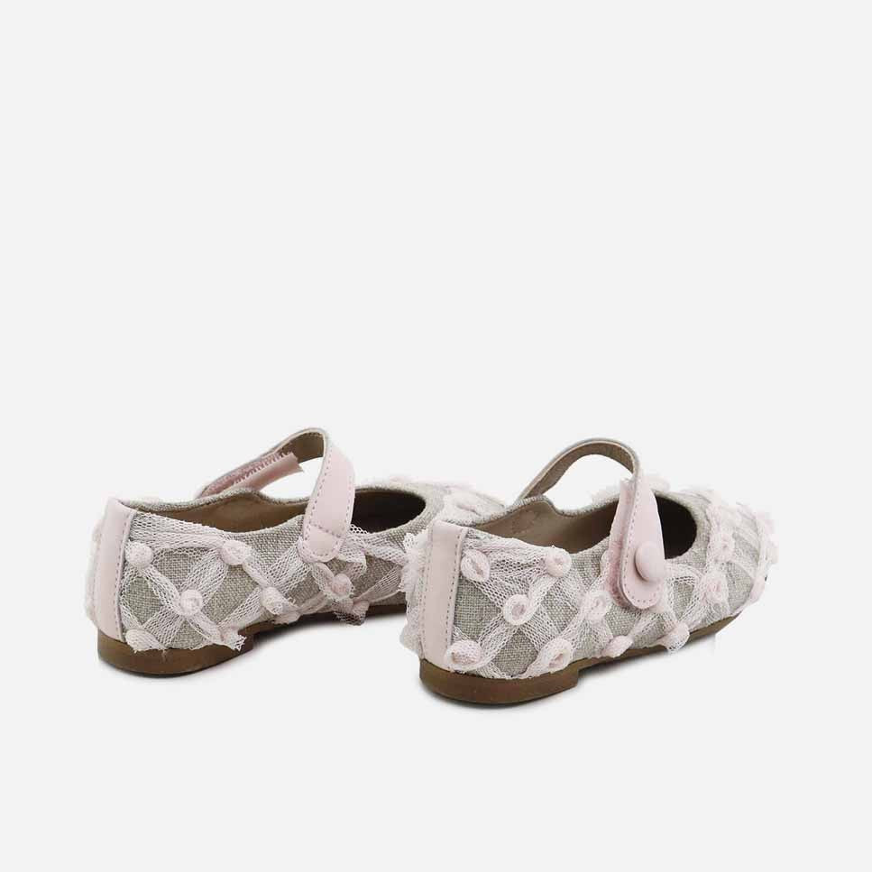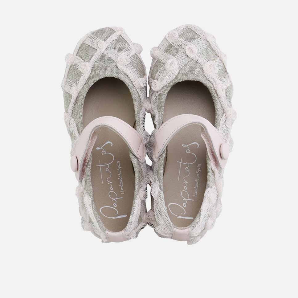 40124AJ-LINEN-TULLE-MAKEUP The most special Mary Janes in our PAPANATAS collection. After the success of previous seasons, they're now back with a linen base. They were designed to be the most special item for that event, but our customers have made them their staple since they're very wearable and incredibly comfortable because they adapt to the foot. Made of natural linen with tulle details. Breathable leather lining. Very comfortable Velcro closure. Also available in ballerina style. Opt for traditional footwear, improved by the advances of so many years of tradition, for today's girls. Quality footwear is an investment in sustainability. Designed and handcrafted in Villena with high-quality materials and with our ballerina last, so highly valued for its style and for preserving all the characteristics of fit and stability, favoring the security and confidence of the steps of girls and women. With a thin, flexible, and non-slip sole, yet resistant to any surface. Handmade in Spain with love.