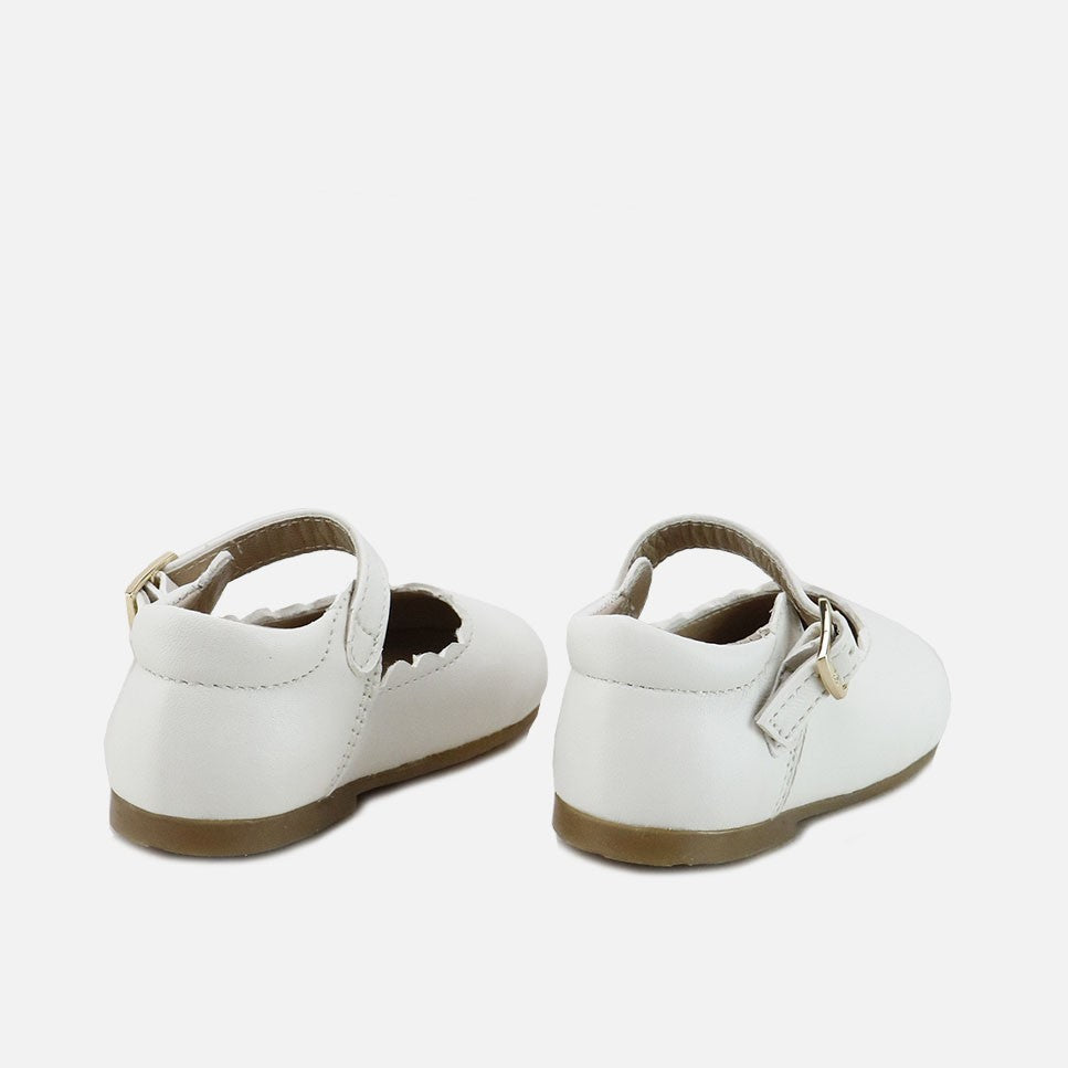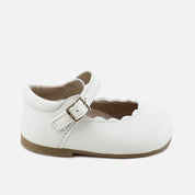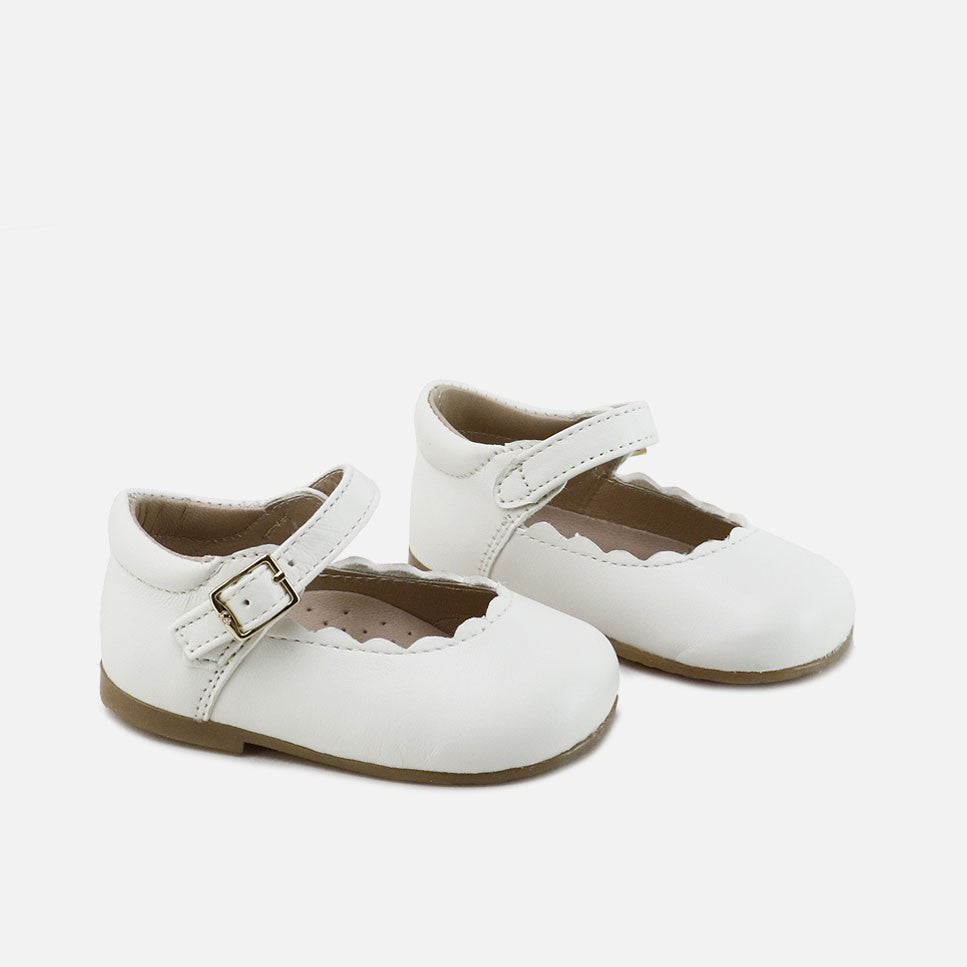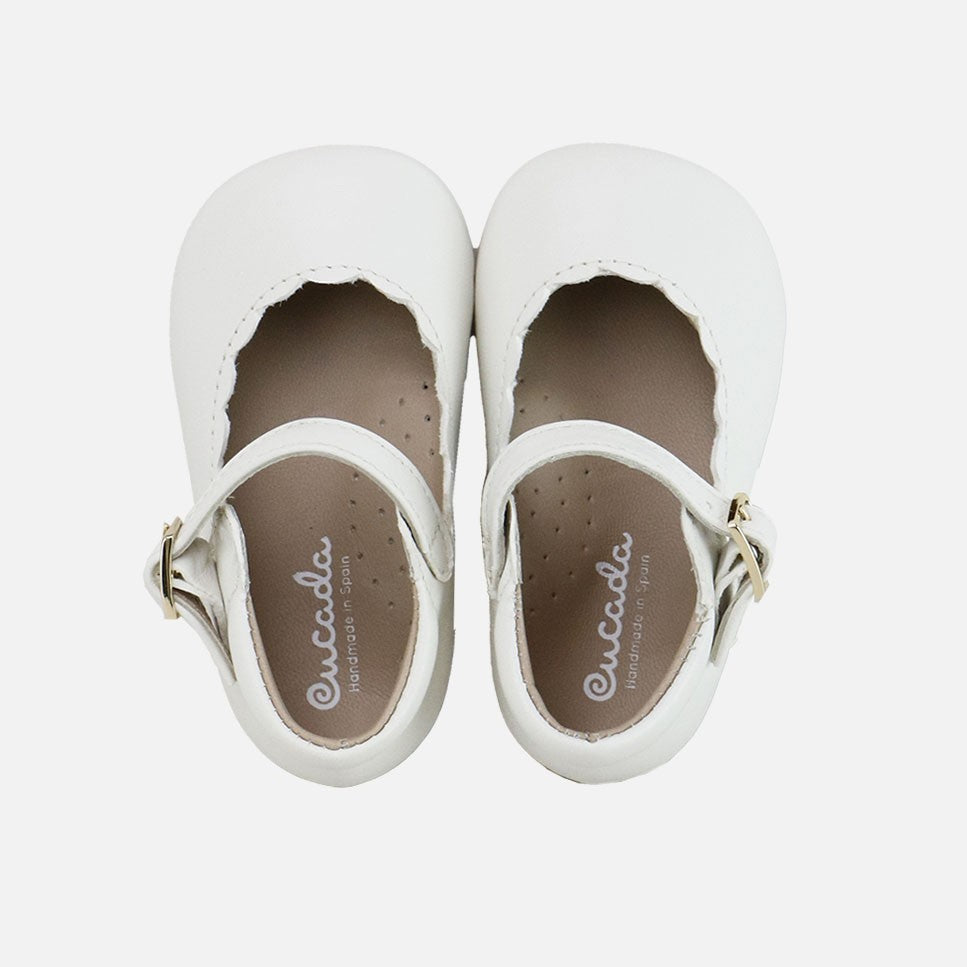 Our CUCADA collection is named after models like this one. The ideal Mary Jane shoe, as classic as it is different. Their cut and waves make them extra special, and their metallic leather makes them the perfect choice for any occasion... they go with everything! CUCADA Mary Janes with wave trim, which support feet from size 17 onwards as they gain confidence as they walk, so that they gradually strengthen and develop freely, yet protect them with every step. Available in different colors of sheepskin or suede, and with a high-quality, breathable, and very soft goatskin lining, so they can be worn with or without socks. Buckle closure. Designed and manufactured in Villena, with style while maintaining all the important fit and stability characteristics of healthy footwear for first-time walkers. Wide last to give little toes complete freedom, and a flat, non-slip, flexible leather-effect rubber sole. Handmade in Spain with love.