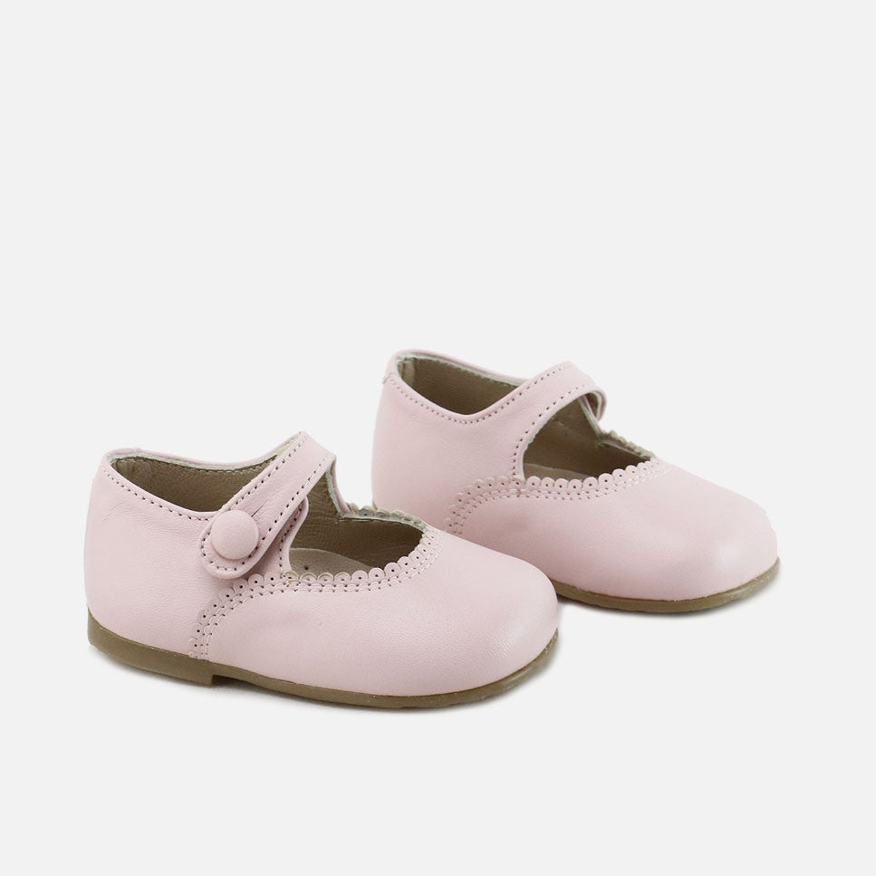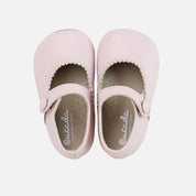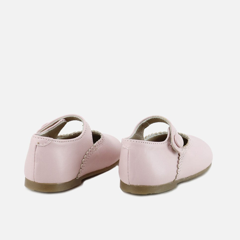 The little Mary Jane from our Eliclassics collection, which dresses the most special feet for unforgettable moments every year. In super-coordinating colors, it elevates any look. A scalloped-edge Mary Jane from the CUCADA collection, this shoe supports feet from size 17 onward as they gain confidence while walking, gradually strengthening and developing freely, while protecting them with every step. Made of cowhide leather and a high-quality, breathable, and very soft goatskin lining, they can be worn with or without socks. Buttonhole closure. Designed and manufactured in Villena, with style while maintaining all the important fit and stability characteristics of healthy footwear for first-time walkers. A wide last to allow complete freedom for little toes, and a flat, non-slip, flexible leather-effect rubber sole. Handmade in Spain with love.