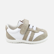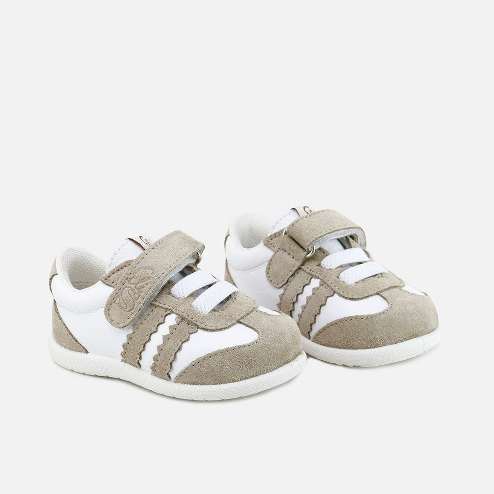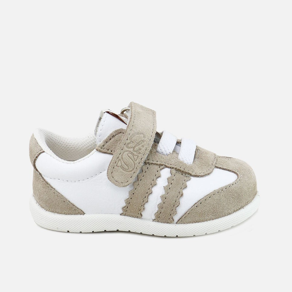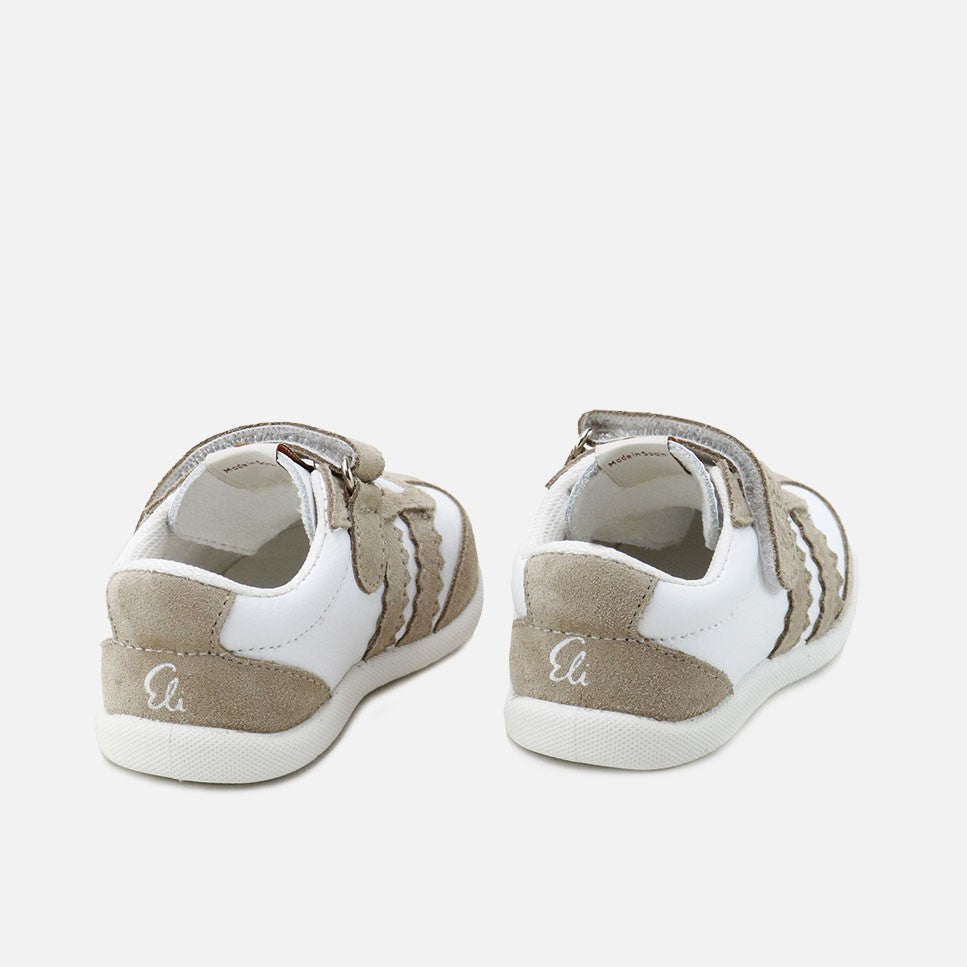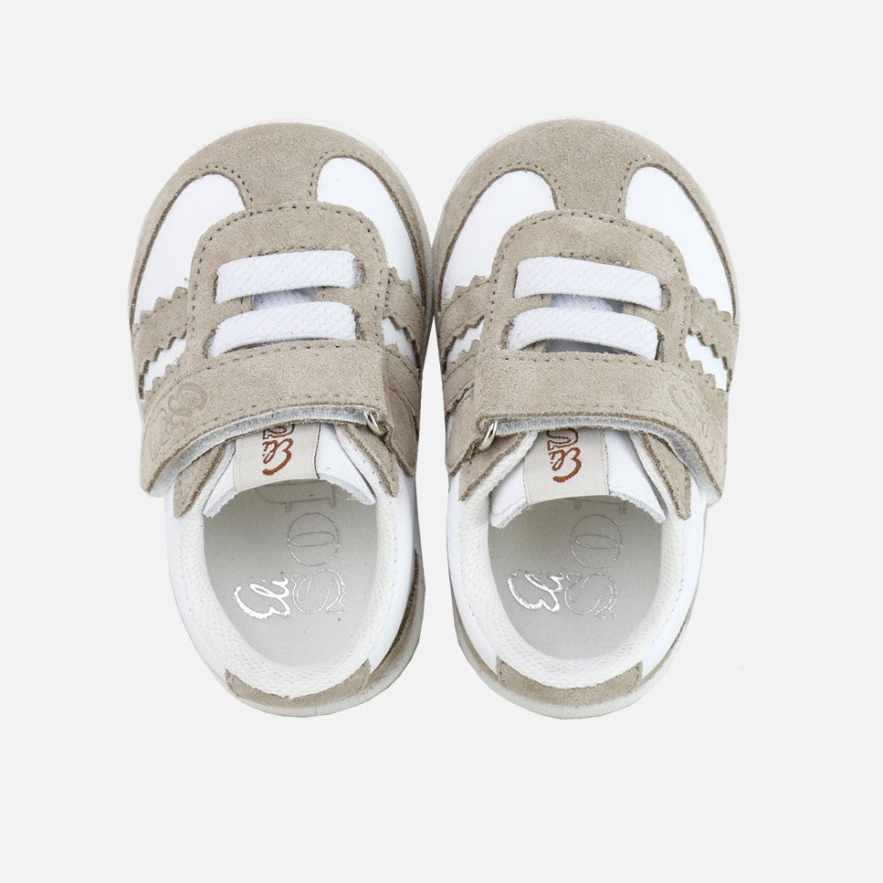 Combined leather and suede sneakers with a hook-and-loop closure and elastic laces, perfect for our little explorers' sporty looks.