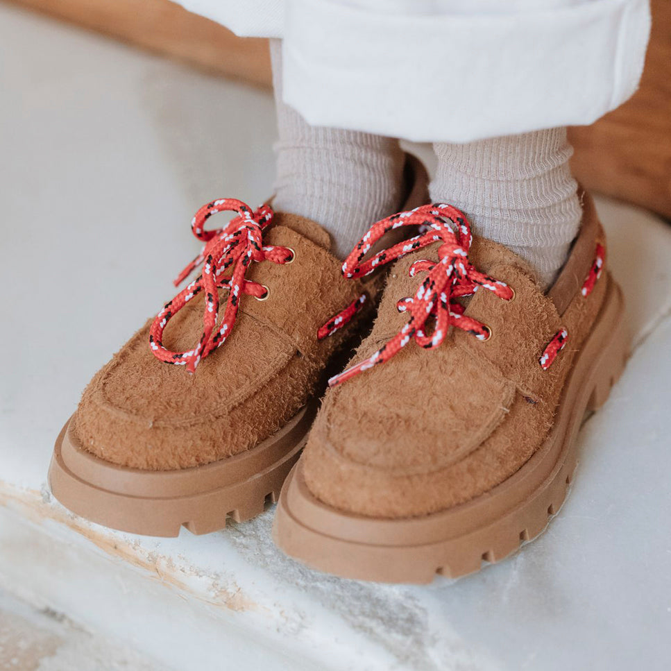 The special boat shoe from our SIBARITAS collection. A groundbreaking and stylish model for the most fashionable little ones. Made from soft, rustic-finish, plush bovine leather, with a breathable leather lining and insole, perfect for wearing with or without socks. They fit like a glove—total comfort! They fasten with two-tone red and white laces. Designed and handcrafted in Villena, Spain, they are hand-stitched with high-quality materials and our special last, adapted for a more robust and daring design. The non-slip, serrated rubber sole is perfect for any surface and super durable. Quality footwear is an investment in sustainability. They fit true to size. Handmade in Spain with love.