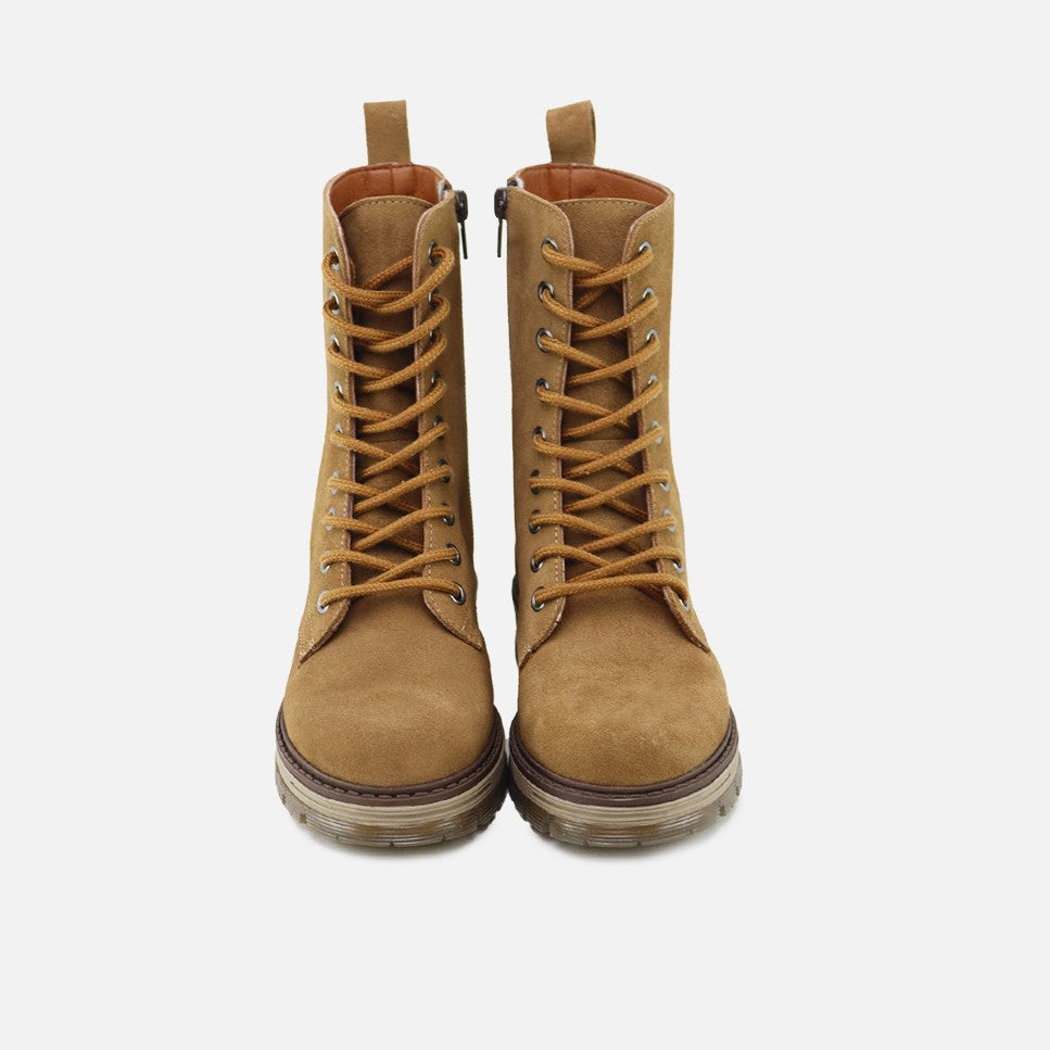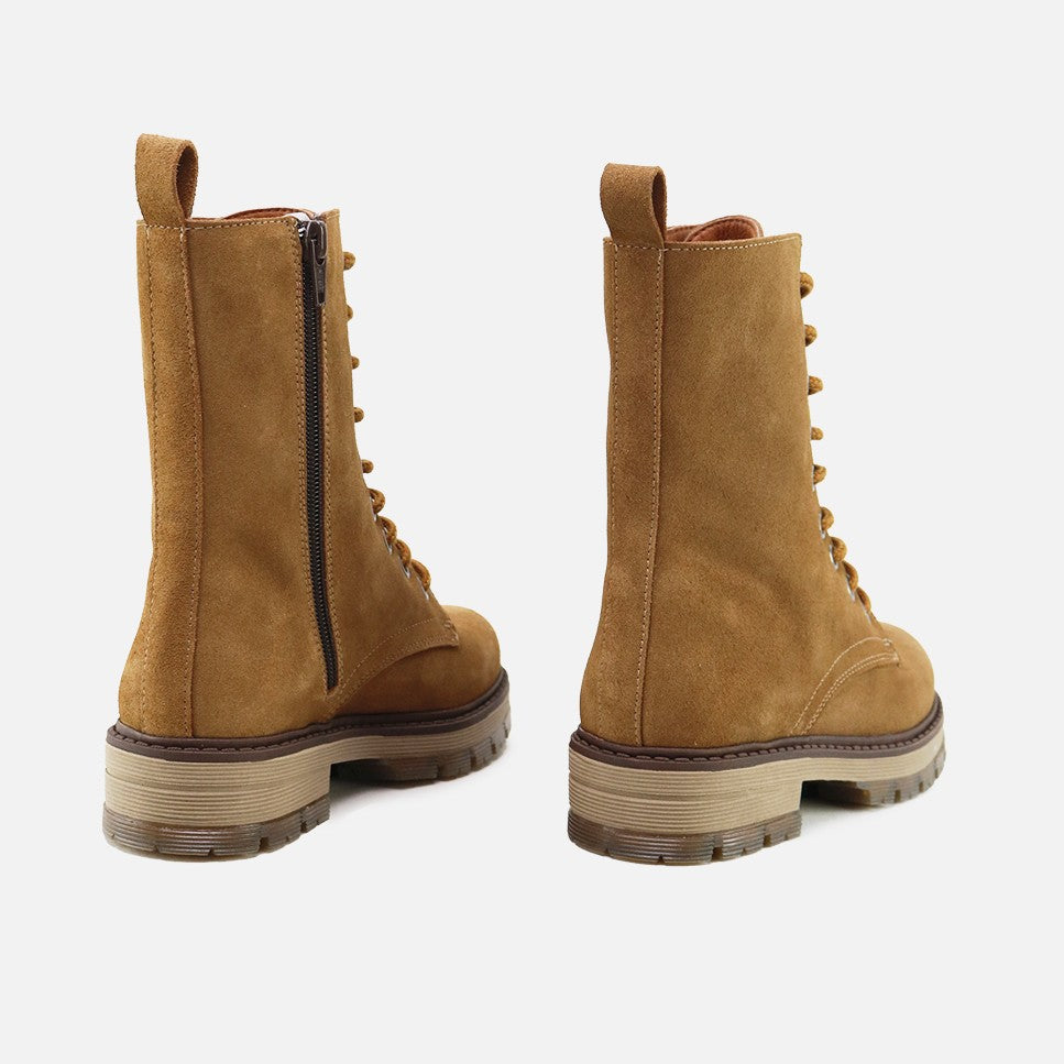 The most ideal military-style boot of the season. You'll want to wear it every day, and it's ready for just that! With these exquisitely high-quality boots, we want Eli's feet to be on trend, yet protected and comfortable, while maintaining our signature style. Well-shod is the first step to a multitude of unforgettable plans. We think they look great with both skirts and pants—they'll be the perfect touch! Made of water-repellent cowhide suede, with a thick track rubber sole and a breathable full leather lining. With matching laces to adapt to any foot, and an interior zipper closure for easy use. We love them for girls and moms. Available in sizes 32 to 41. Designed and handcrafted in Villena with high-quality materials. With a thick track-type rubber sole, non-slip and resistant to any surface. Opt for traditional footwear, improved by the advances of so many years of tradition. Quality footwear is an investment in sustainability. Handmade in Spain with love.