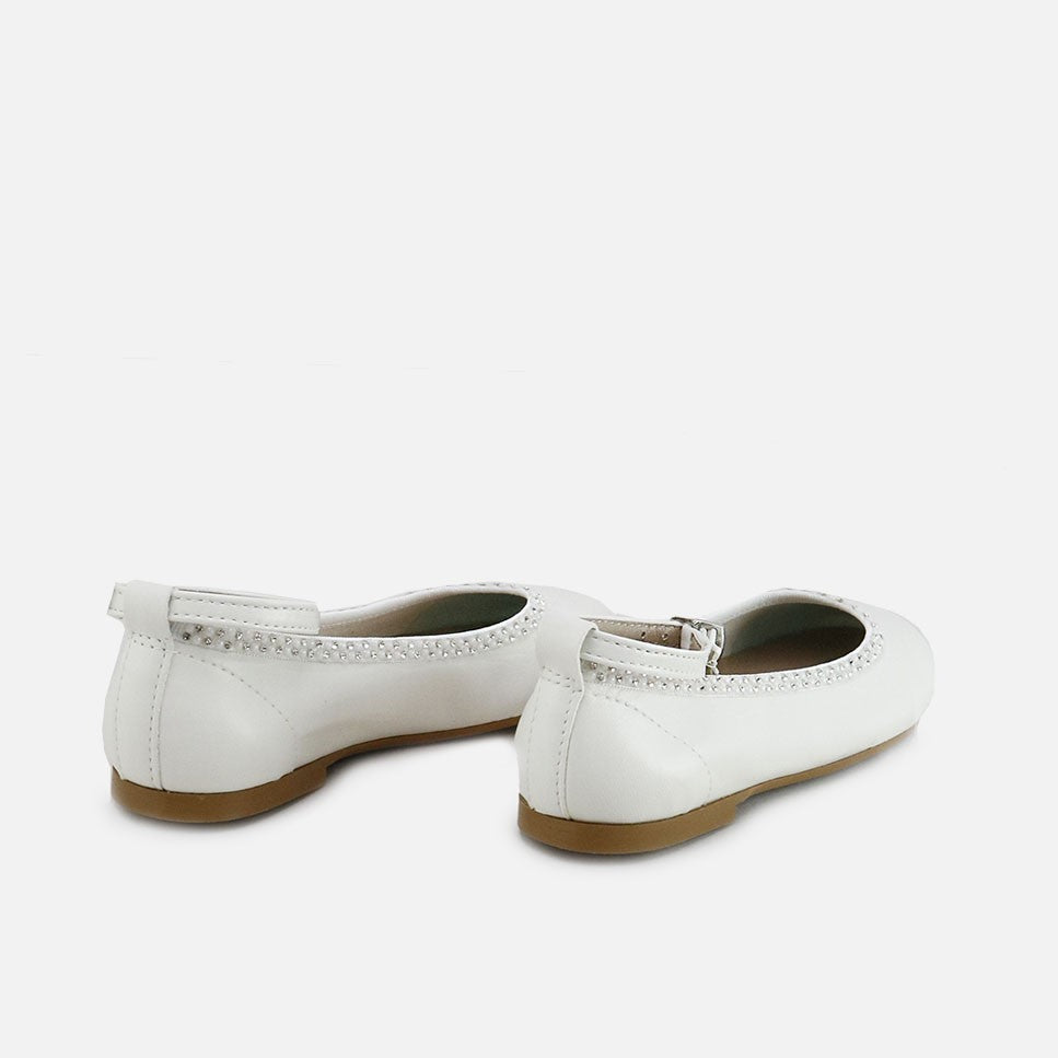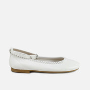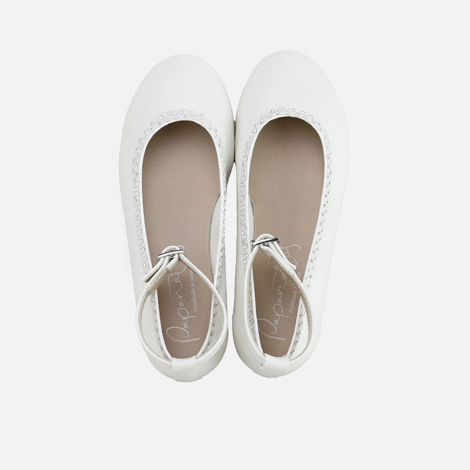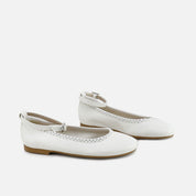 One of our jewels, designed to make those unforgettable days even more special, while remaining highly wearable afterward! Ballerina flats with pearl trim and ankle strap from our PAPANATAS collection. The pearl trim is ideal, and the ankle strap is very stylish! Opt for traditional footwear, improved by the advances of so many years of tradition, for today's girls. Quality footwear is an investment in sustainability. Made of pearly sheepskin with a breathable leather lining. Once worn, they adapt perfectly to the foot. Designed and handcrafted in Villena with high-quality materials and using our ballerina last, so highly valued for its style and for maintaining all the characteristics of fit and stability, promoting the security and confidence of girls' and women's steps. With a thin, flexible, and non-slip sole, yet resistant to any surface. Handmade in Spain with love.