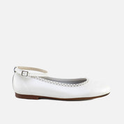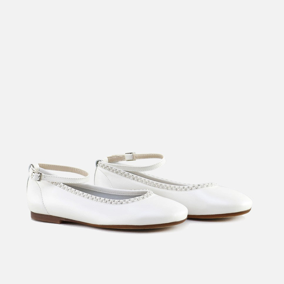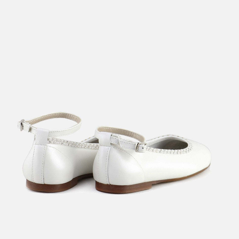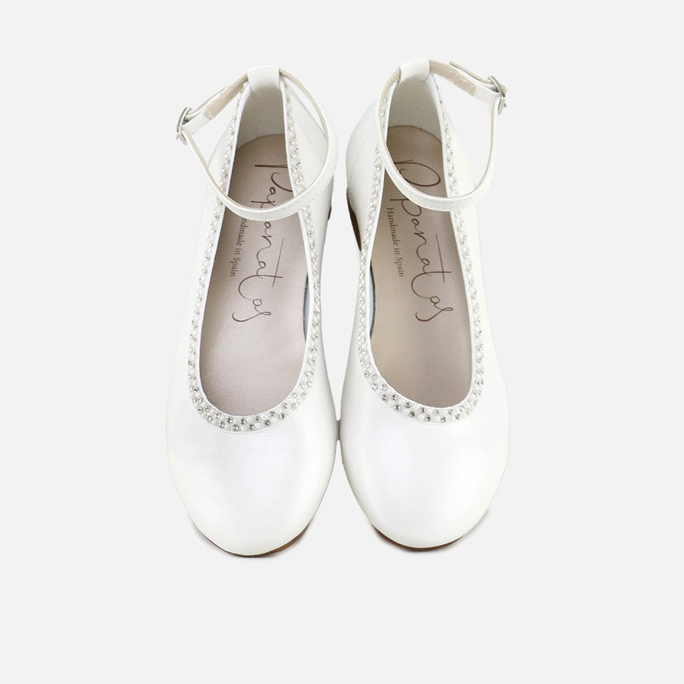One of our jewels, designed to make those unforgettable days even more special, while remaining highly wearable afterward! Ballerina flats with pearl trim and ankle strap from our PAPANATAS collection. The pearl trim is ideal, and the ankle strap is very stylish! Opt for traditional footwear, improved by the advances of so many years of tradition, for today's girls. Quality footwear is an investment in sustainability. Made of pearly sheepskin with a breathable leather lining. Once worn, they adapt perfectly to the foot. Designed and handcrafted in Villena with high-quality materials and using our ballerina last, so highly valued for its style and for maintaining all the characteristics of fit and stability, promoting the security and confidence of girls' and women's steps. With a thin, flexible, and non-slip sole, yet resistant to any surface. Handmade in Spain with love.