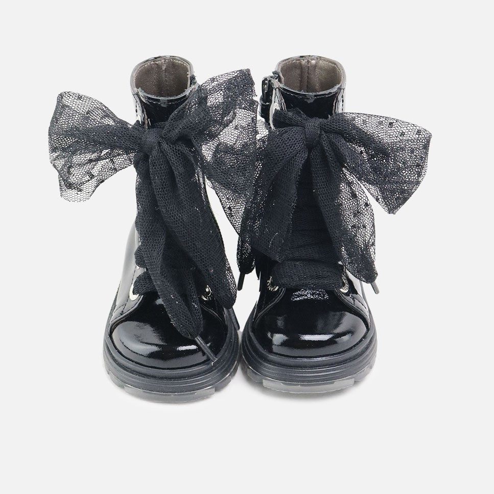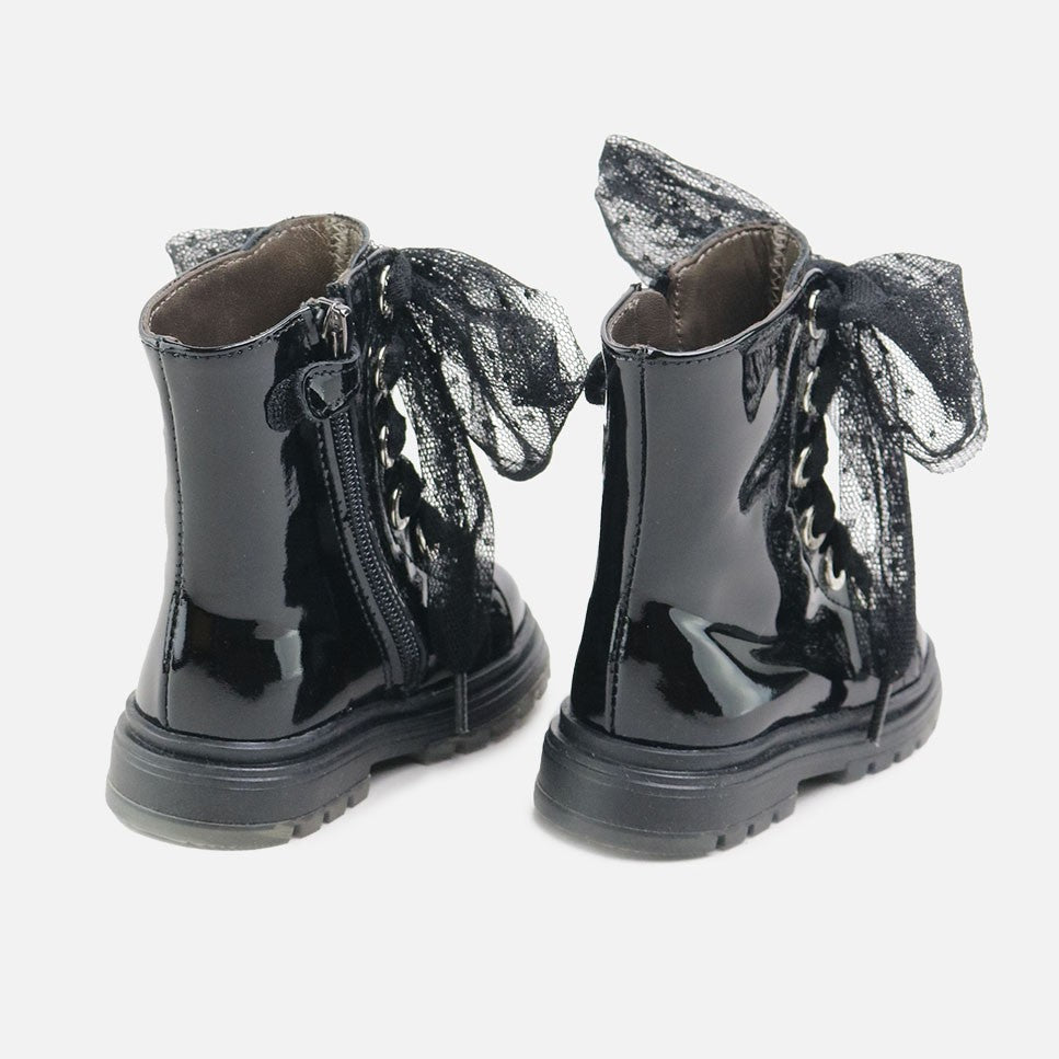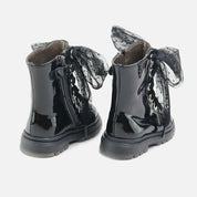 Mid-calf patent leather boot from our SIBARITAS collection, which will fit the trendiest feet this season. Based on a classic design, its materials, metallic details, and plumeti straps are what give it a 10. With this model, which they can combine with everything, they'll be incredibly comfortable and their feet will be cared for, allowing them freedom while protecting them from all movements, surfaces, and temperatures. Made of high-quality bovine patent leather and a breathable cowhide lining that prevents sweat and keeps feet at their ideal temperature. With matching plumeti fabric straps as a finishing touch. Zip closure for easy use. Designed and handcrafted in Villena with high-quality materials and with our last, backed by more than 30 years of experience, wide at the front to allow room for little toes and perfect for protecting their heels. With flexible, non-slip rubber track soles, yet resistant to any surface. Opt for traditional footwear, improved by the advances of so many years of tradition, for today's children. Quality footwear is an investment in sustainability. Handmade in Spain with love.