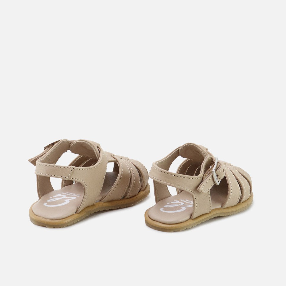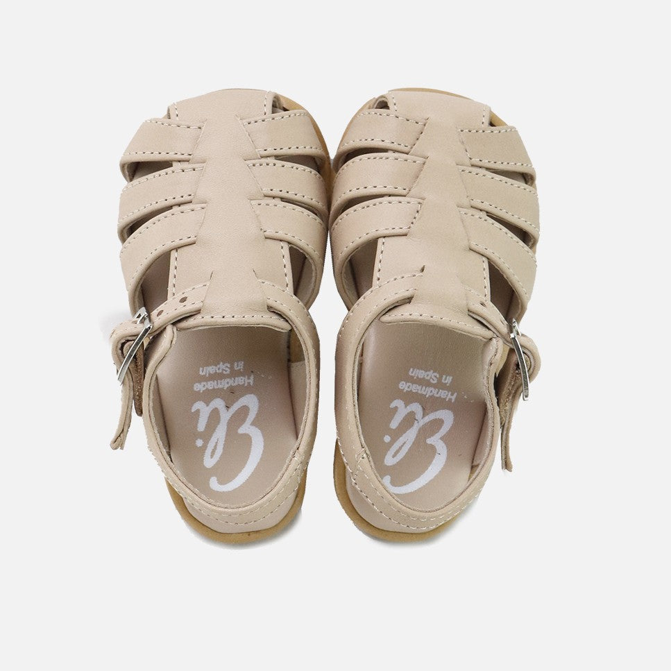 The ideal sandals for their first experiences. Our most flexible and softest footwear, made of natural leather, with a flat, lightweight, non-slip rubber sole that supports their movements and is also beautiful :) Like going barefoot! Crab-style sandals from Eli's RESP line. We accompany them as they gain confidence, so that little by little their feet strengthen and develop freely, while protecting them with every step. Made of cowhide and a high-quality, breathable, and very soft goatskin lining. High-quality materials that fit perfectly. Buckle closure to adapt to any width. Designed and manufactured in Villena, with style while maintaining all the important fit and stability characteristics of healthy footwear for first walkers. Wide last to give their little toes complete freedom and a flexible sole. Handmade in Spain with love.