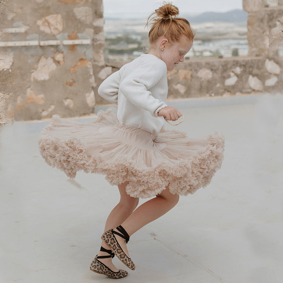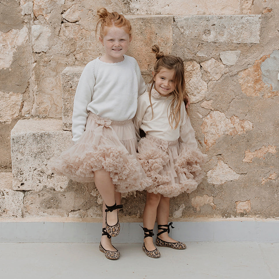 Super soft, supple leather ballet flats from our PAPANATAS collection, perfect for girls and moms alike. Perfect for sharing. So comfortable they won't want to take them off! A classic from our collection, sought-after every season for being perfect for any occasion. Made from leopard-effect split leather with a high-quality, breathable, and very soft capri-leather lining. With an internal elastic band and elastic strap to tie the ankle or leg as desired. Once worn, they adapt perfectly to the foot. Designed and handcrafted in Villena with high-quality materials and using our ballerina last, so highly regarded for its style and for maintaining all the characteristics of fit and stability, promoting the security and confidence of girls' and women's steps. With a thin, flexible, and non-slip sole, yet resistant to any surface. Handmade in Spain with love.