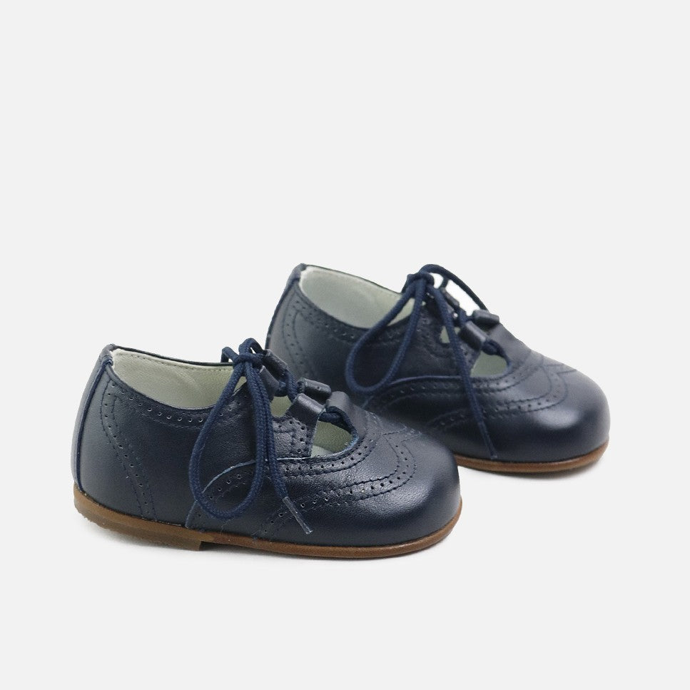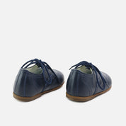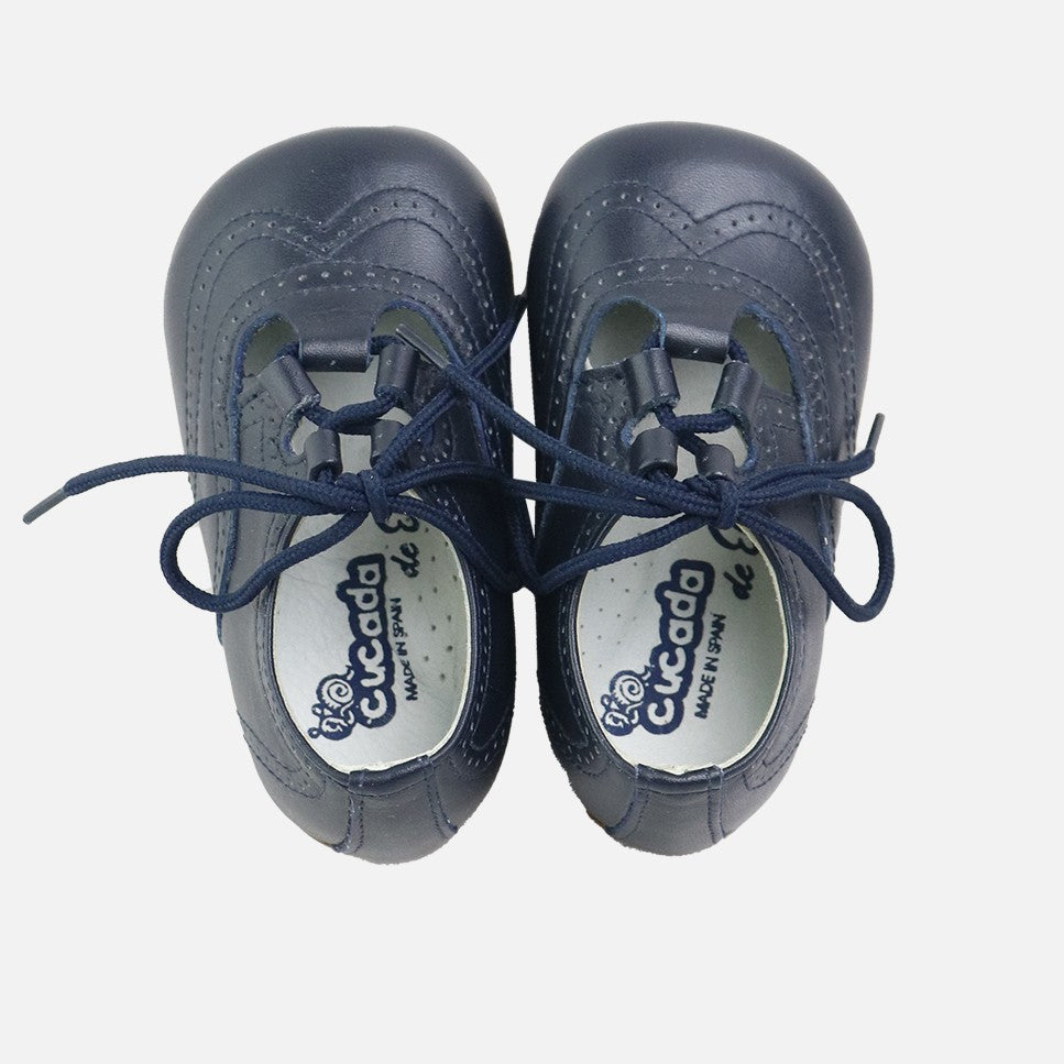 Our classic Welsh shoe from the CUCADA collection for first steps. In this tongueless version, they're ideal for Spring/Summer, with or without socks. A classic design with the perfect fit for any occasion. Made of cowhide nappa leather and a breathable leather lining. Available in various colors. The lace-up closure makes them adaptable to any foot. Available from sizes 17 to 25. Designed and manufactured in Villena, with style while maintaining all the important fit and stability features of healthy footwear for first walkers. A wide fit allows complete freedom for little toes, and a flat, non-slip, flexible leather-effect rubber sole. Handmade in Spain with love.