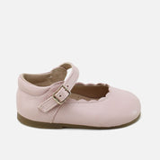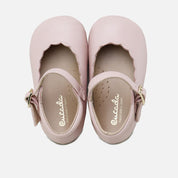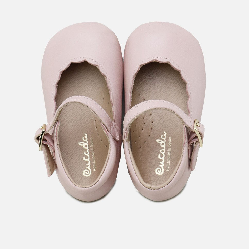 Our CUCADA collection is named after models like this one. The ideal Mary Jane shoe, as classic as it is different. Their cut and waves make them extra special, and their metallic leather makes them the perfect choice for any occasion... they go with everything! CUCADA Mary Janes with wave trim, which support feet from size 17 onwards as they gain confidence as they walk, so that they gradually strengthen and develop freely, yet protect them with every step. Available in different colors of sheepskin or suede, and with a high-quality, breathable, and very soft goatskin lining, so they can be worn with or without socks. Buckle closure. Designed and manufactured in Villena, with style while maintaining all the important fit and stability characteristics of healthy footwear for first-time walkers. Wide last to give little toes complete freedom, and a flat, non-slip, flexible leather-effect rubber sole. Handmade in Spain with love.
