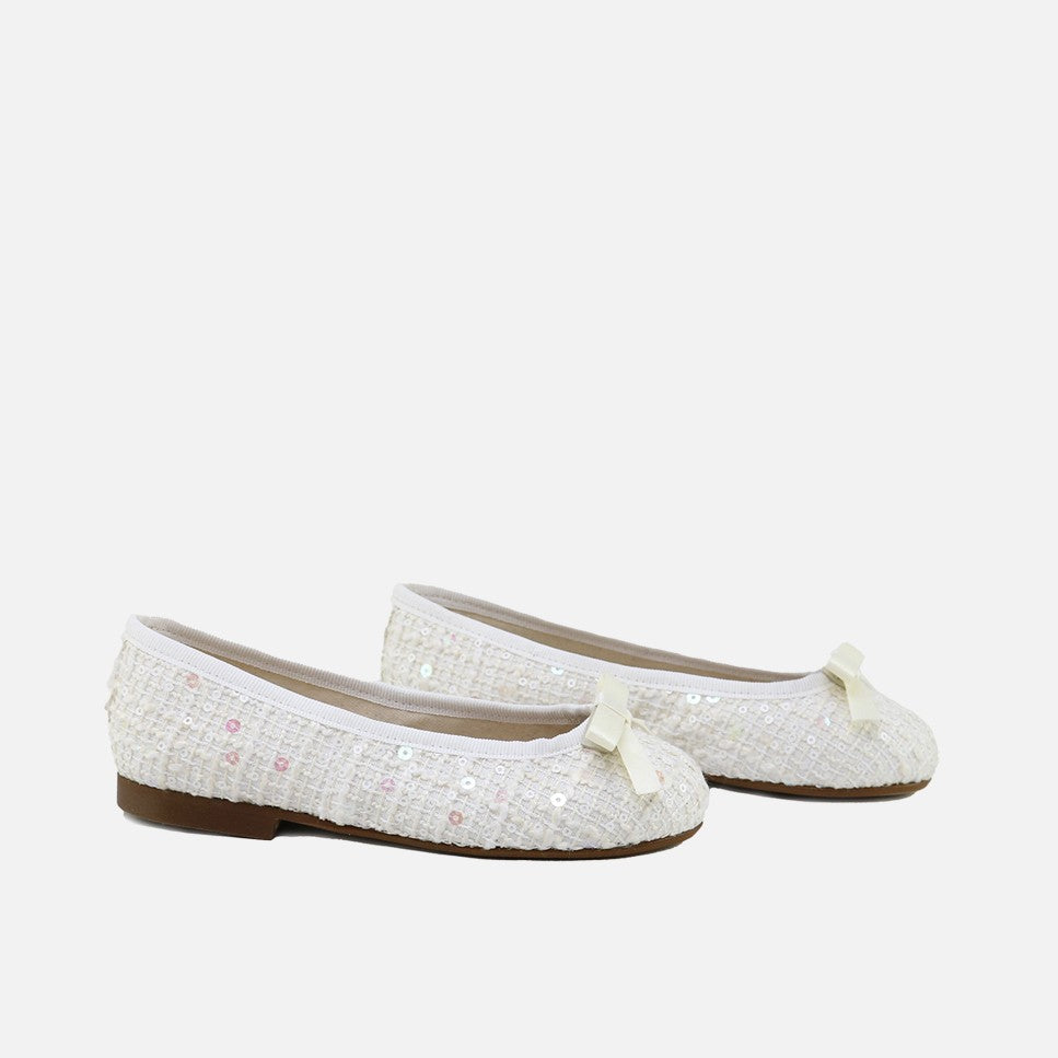 A wonderful model that, without having anything, has everything! Chanel-style cotton and sequin ballerinas with a bow and grosgrain ribbon from our PAPANATAS collection, which dresses the feet of girls and mothers. Ideal for sharing a model. We love them for everything, from ceremonies to everyday wear. Quality footwear is an investment in sustainability. Made in a super-pretty beige textile, with a breathable, thermoregulating fabric lining and a breathable leather insole. Once worn, they adapt perfectly to the foot. Designed and handcrafted in Villena with high-quality materials and using our ballerina last, so highly regarded for its style and for maintaining all the characteristics of fit and stability, promoting the security and confidence of girls' and women's steps. With a thin, flexible, and non-slip sole, yet resistant to any surface. Handmade in Spain with love.