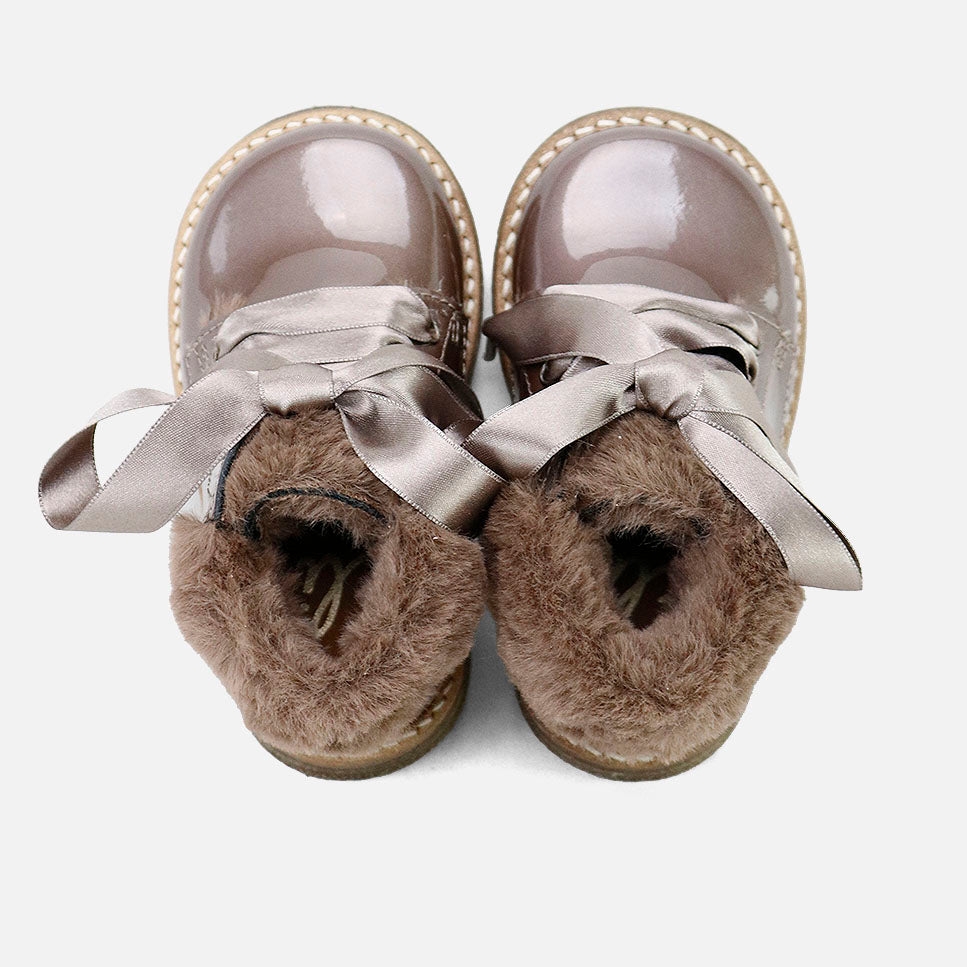 Bota de charol con pelito, de nuestra colección SIBARITAS, que calzará los pies más trendy esta temporada. Diseñado para las niñas más coquetas, pero que no quieren renunciar a la comodidad. Con este modelo, que podrán combinar con todo, irán muy calentitas y sus pies estarán cuidados para permitirle libertad, pero protegiendoles en todo movimiento, superficie y temperatura. Hechas en charol bovino de alta calidad con acolchado, lengüeta y forro de borreguito textil. Plantilla de piel vacuna transpirable que evita el sudor y mantiene los pies en su temperatura ideal. Con cintas de raso al tono, como toque final. Diseñadas y fabricadas artesanalmente en Villena con materiales de alta calidad y con nuestra horma avalada tras mas de 30 años, amplia por delante para dejar espacio a sus deditos y perfecta para protegerles el talón. Con suela rugosa de goma, flexible y antideslizante, pero resistente a cualquier superficie. Apuesta por el calzado de toda la vida, mejorado por los avances de tantos años de tradición, para los niños de hoy en día. Calzado de calidad, es una inversión en sostenibilidad.