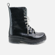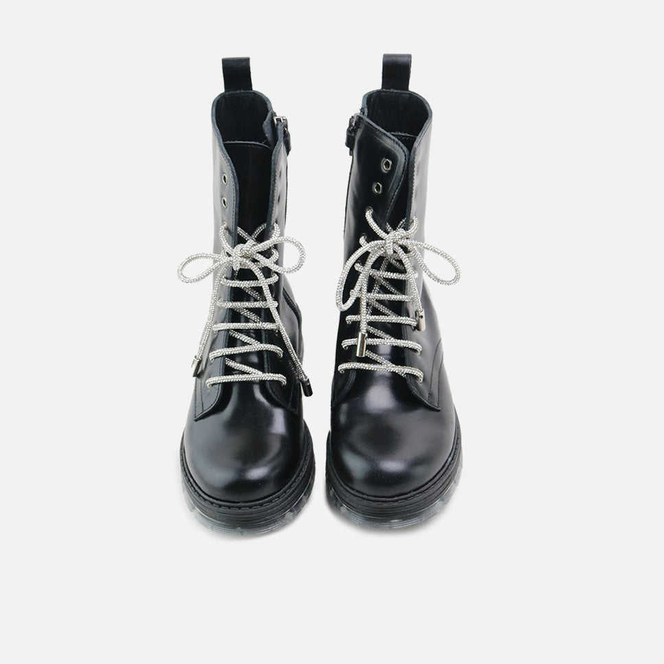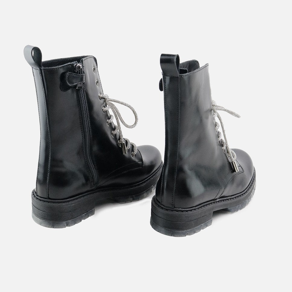 La bota militar favorita de nuestra colección SIBARITAS, que calzará los pies más trendy esta temporada. Las elegirás por su diseño y cordones, y no te las quitarás por su comodidad. Con estas botas de calidad exquisita, queremos que los pies Eli vayan a la última, pero que estén protegidos y cómodos, manteniendo el estilo que nos caracteriza. Realizadas en piel vacuna efecto brillo de alta calidad, piso grueso negro de TR y forro entero de piel transpirable. Disponibles hasta la talla 41, son perfectas para niña y mamá. Su color y brillo y las cordoneras metálicas les dan el toque perfecto. Diseñadas y fabricadas artesanalmente en Villena con materiales de alta calidad. Apuesta por el calzado de toda la vida, mejorado por los avances de tantos años de tradición, para los niños y mujeres de hoy en día. Calzado de calidad, es una inversión en sostenibilidad. Handmade in Spain with love.