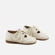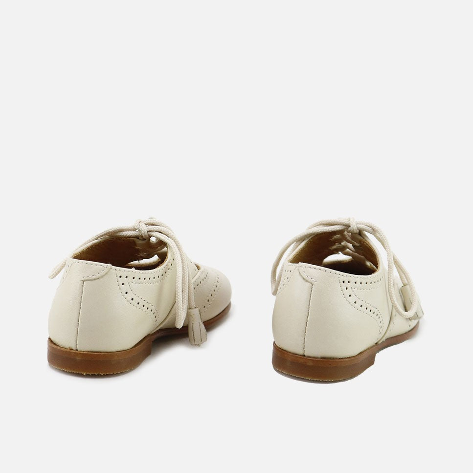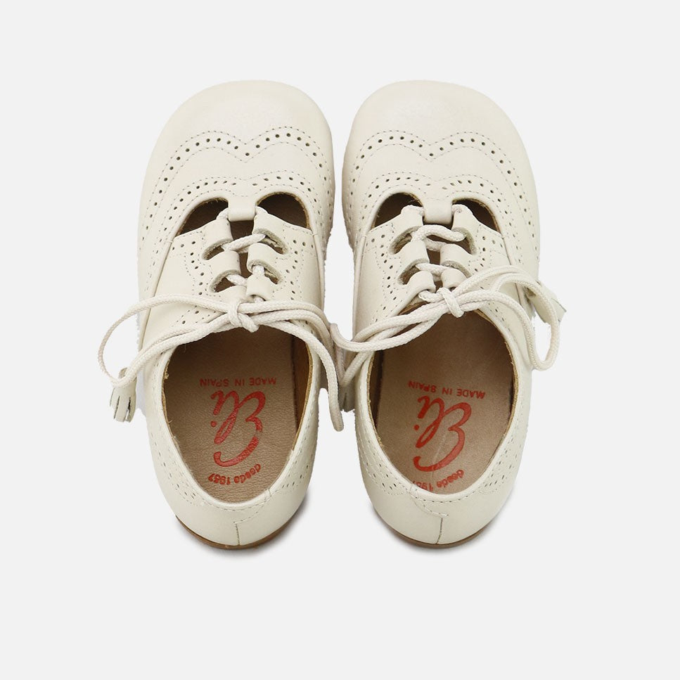 Zapato Inglés clásico Eli con picados, versión sin lengüeta. El calzado favorito para vestir con clase y estilo. Su horma, corte y picados, hacen que año tras año sean un éxito de ventas. Los clásicos que perdurarán en el tiempo y que marcan la diferencia a simple vista. Hechos en piel de alta calidad con forro de piel transpirable que evita el sudor y mantiene los pies en su temperatura ideal. Disponibles en varias combinaciones, ¡elige tu favorita! Cierre mediante cordonera redonda de algodón con borlas de la misma piel. Diseñados y fabricados artesanalmente en Villena con materiales de alta calidad y con nuestra horma tan bien valorada por su estilo y por conservar todas las características de ajuste y estabilidad, favoreciendo la seguridad y confianza de los pasos de los niños. Con suela de goma fina, flexible y antideslizante, pero resistente a cualquier superficie. Apuesta por el calzado de toda la vida, mejorado por los avances de tantos años de tradición, para las niños de hoy en día. Calzado de calidad, es una inversión en sostenibilidad. Calzan su talla real. Handmade in Spain with love.