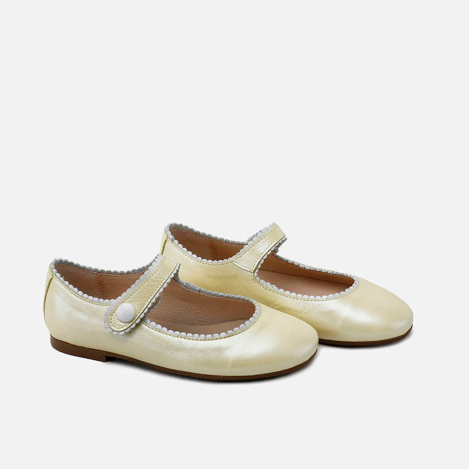 Este modelo reinventa la merceditas clásica con un acabado metalizado en tono suave que aporta luz, frescura y un toque especial. Su delicado ribete festoneado en el escote añade un detalle femenino y cuidado, convirtiéndolas en el calzado perfecto para ceremonias, comuniones, ocasiones especiales y también para looks más luminosos del día a día.