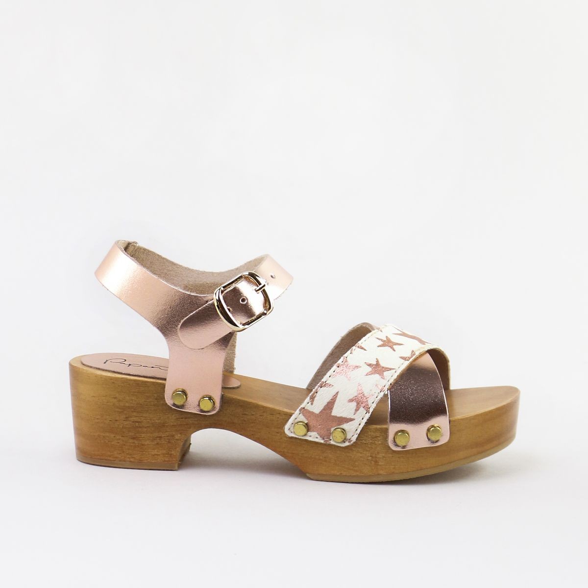 Sandalia tipo zueco con tiras cruzadas y cierre de hebilla.