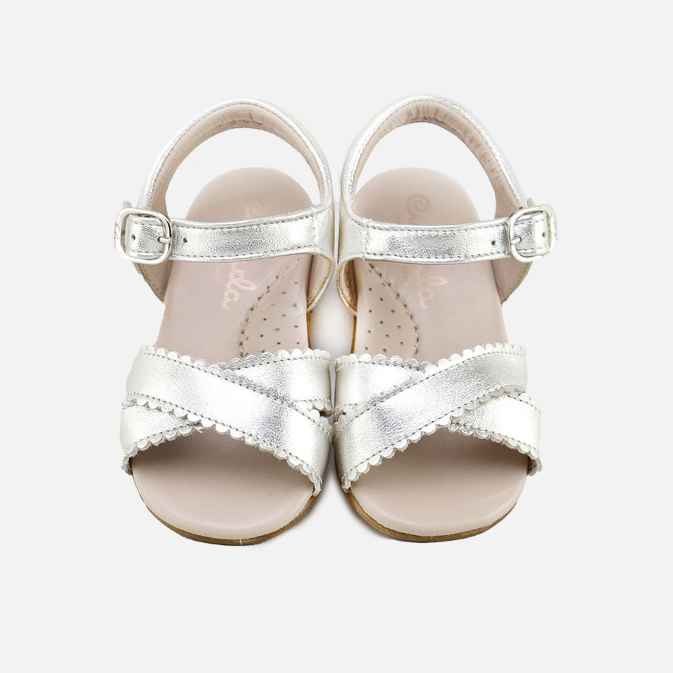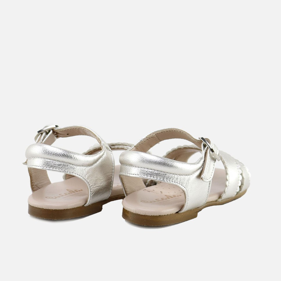 Una cucada de sandalia, con la que no pararán en todo el verano. Tan perfecta en diseño y sujeción, que se ha convertido en un clásico. Fabricadas en piel ovina metalizada y forro interior transpirable de piel caprina de alta calidad, transpirante y muy suave, ¡para ir cómodos y fresquitos! Cierre de hebilla. Diseñados y fabricados en Villena, con estilo y conservando todas las características importantes de ajuste y estabilidad de un calzado saludable para primeros caminantes. Calzamos los pies desde la talla 17 mientras adquieren confianza al andar, para que poco a poco se fortalezcan y desarrollen con libertad pero protegiéndoles en cada paso. Horma amplia para dejar total libertad a sus deditos y suela plana de goma antideslizante y flexible. Handmade in Spain with love.