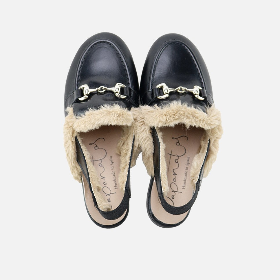 Mocasín tipo slipper Papanatas by Eli con correa elástica. El modelo que enamorará a cada paso, pero sobretodo al que lo calce. Su color perfecto, el vivo y forro de pelo tan suave, y el estribo metálico como detalle, los hacen únicos. Realizado en piel vacuna de alta calidad, vivo de pelo y forro entero en contraste de pelo de algodón muy suave, para ir calentito y protegido. Con correa trasera de la misma piel y elástico para adaptarse a cualquier pie. Diseñados y fabricados artesanalmente en Villena con materiales de alta calidad y con nuestra horma especial de bailarinas que favorece la seguridad y confianza de los pasos de niñas y mujeres. Con suela fina, flexible y antideslizante, pero resistente a cualquier superficie. Zapatos perfectos para que niñas y mamás compartan el mismo modelo. Calzado cómodo, urbano, fashion, con detalles originales y de tendencia. Calzado de calidad, es una inversión en sostenibilidad. Handmade in Spain with love.